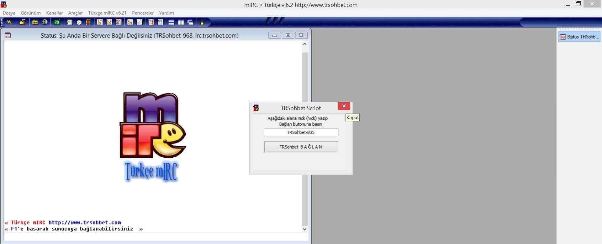 You can connect to the chat by using the software we developed. If you want to connect to our IRC service with our chat program which has passed all security tests and does not bear any threats then you can download and install the program which we shared below to connect to the irc.trsohbet.com server.